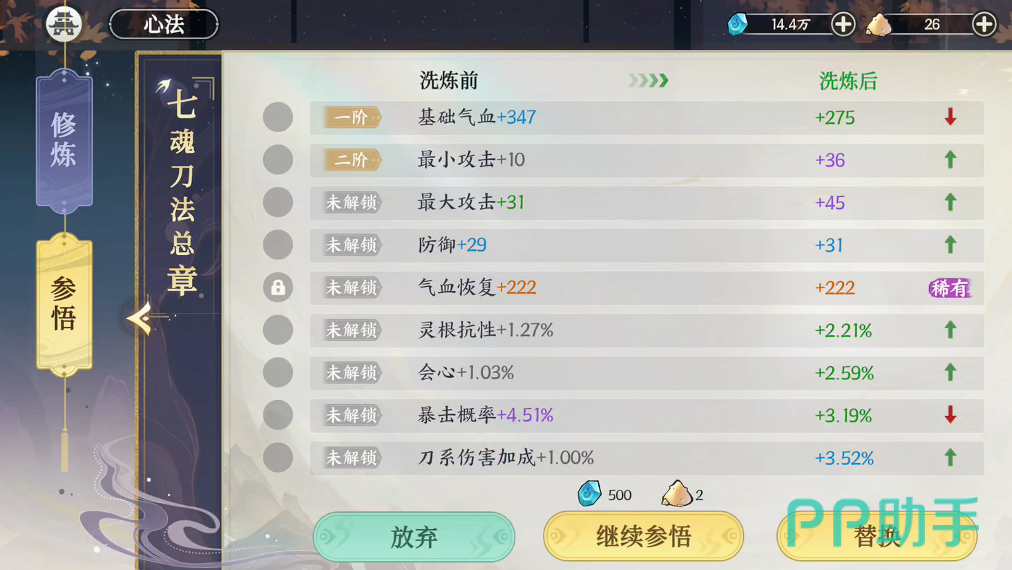 对于主打进攻流的玩家来说,肯定希望洗出一些获得攻击力或者暴击伤害的词条。这时你就可以将自己已经拥有的词条锁定,这样进行参悟的时候就不会更新。当你成功参悟过后,就可以在右边看到新的词条,如果足够满意的话就可以进行替换。