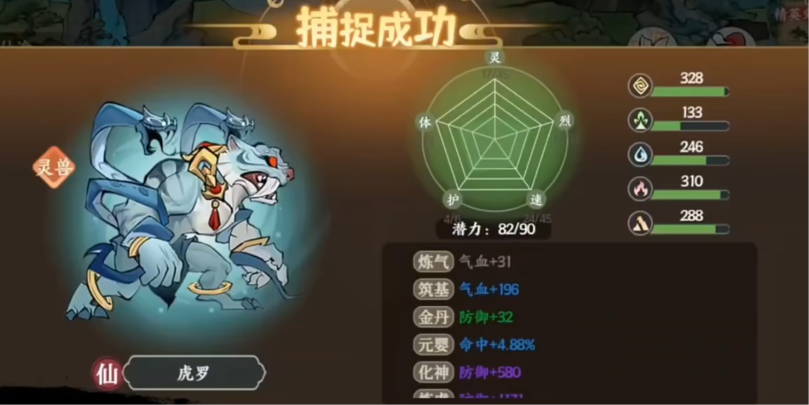 不过要是大家成功捕捉的话,那就会在页面中直接显示当前宠物的各种属性以及各种名字。例如大家成功捕捉了一只虎罗的话,那就会显示出他的各种潜力属性。其中就包括气血,防御,攻击与法术等,一般来说橙色品质的宠物更好。
