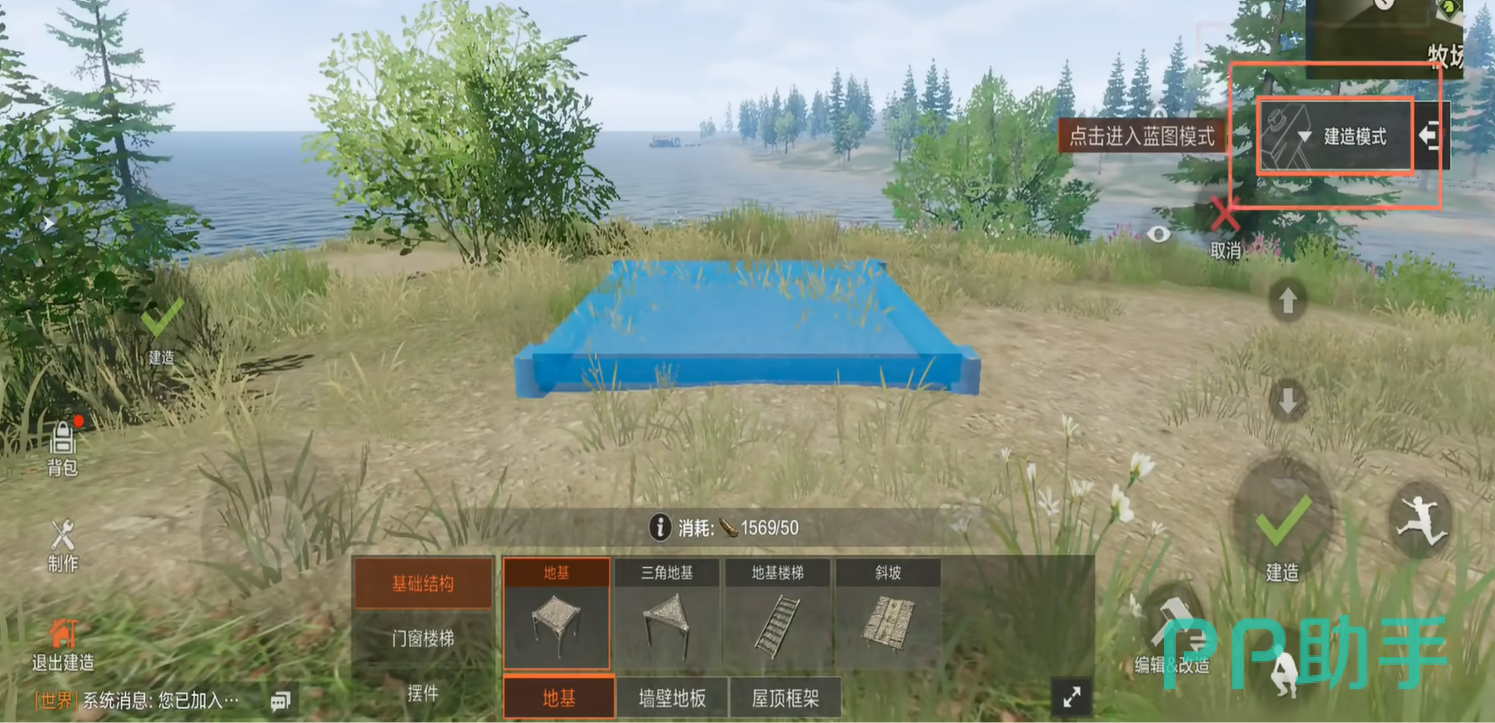 所以这时要优先打造一个基地,基地来说的话需要砍伐大量的木材。这时只需要努力的用自己手中的工具迅速的砍伐周围的树木,当你的木材数量达标之后,就可以直接点击页面左下角的建造。建造虽然说是可以制作基地,但是里面的各种家具的话,还是要在制造页面获取。