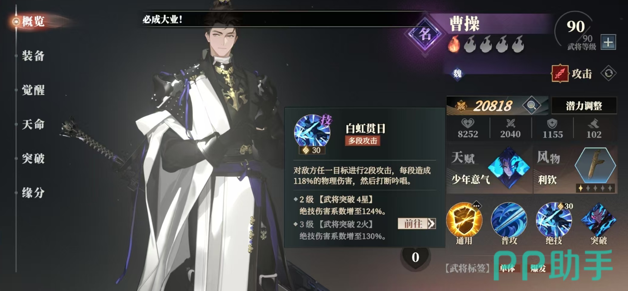 曹操的绝技白虹贯日是一个多段单体攻击技能,对任意目标进行两段攻击,然后直接打断对方的吟唱。这个技能不仅伤害高,更是有着打断效果,在很多战斗中都有着必要。的作用,自身天赋,少年义气战斗开始时永久获得少年无畏状态。如果生命比例首次降至35%以下,那么少年无畏将转换成心魔少年无畏能提升30%暴击率。心魔除了30%暴击率之外,还有30%吸血,这样在曹操采血的时候可以依靠吸血提高生存。