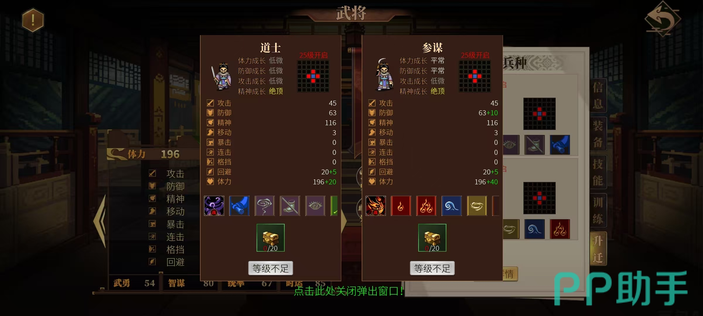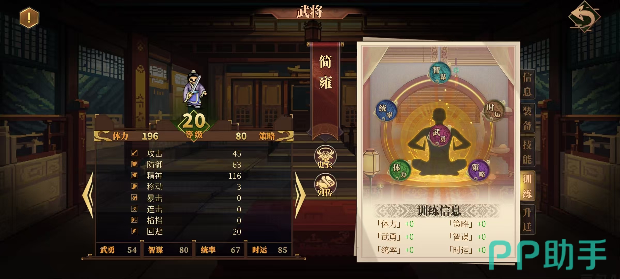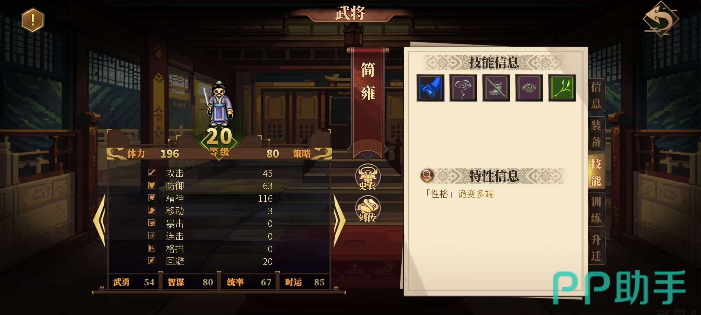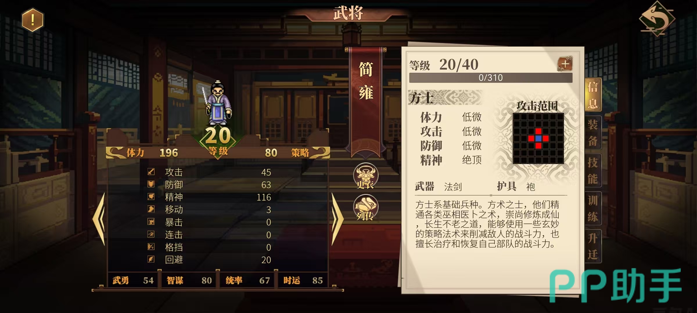 所以减简雍虽然自身的伤害不高,但是带来的各种状态,可以给队伍在战斗中赢得不小的优势。它的特性是诡变多端,每回合能恢复最大策略值的5%,受到的回复策略效果降低10%。在后续升迁的时候,有道士和参谋这两种不同的方向。道士的体力成长低微,防御成长低微,攻击成长低微,精神成长绝顶。参谋的体力成长平常,防御成长平常,攻击成长低微,精神成长绝顶。