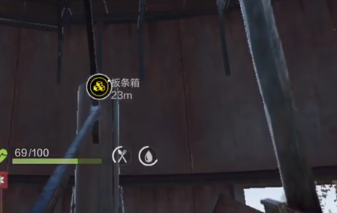 在内部圆盘的上面就会刷新两个物资箱,具体开出来什么全凭运气,拿完从进来的楼梯出来,沿着路到下一个路口,又会进入到下一个圆盘,这里同样有两个物资箱,记得拿完后向着四周的钢管处仔细看看,在下图的这个地方就有一个隐藏板条箱。