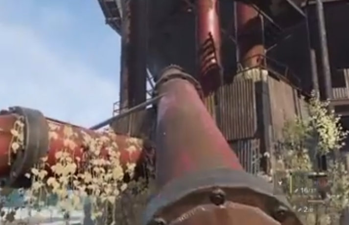 首先大铁球的下方全部都是红油桶,劣质原油就能拿到非常多,在大铁球的旁边能直接找到炼油机,有空的可以在此处原地加工,然后我们顺着大铁球的大铁管走上去,就有一条进入内部的路,沿着路进入铁球的内部。