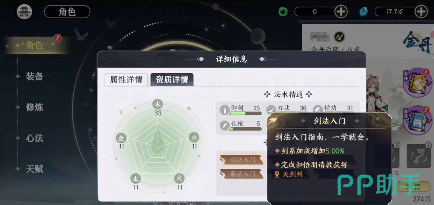 如果大家不知道绝学在哪的话,可以通过游戏中的某个角色打开人物详情,点击第二个资质详情,这时会显示角色当前所拥有的所有资质,例如各种属性,也就是天赋,大家可以根据属性的优缺点,去选择提升的方向。