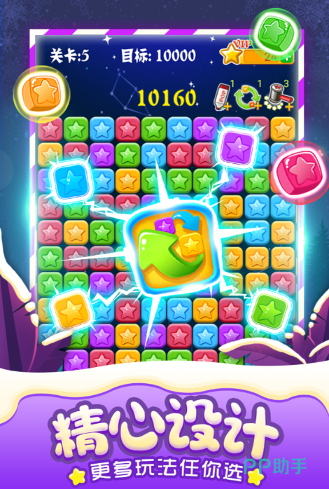 这款游戏准备的小星星五颜六色,大家要做的就是将它们尽可能地消除掉,从而达到更高的分数。游戏准备了海量关卡,大家根本就不用担心玩一下就没了。游戏操作简单,只需要指触屏幕就能玩转每一关。游戏的难度是随着你的逐步通关而层层递进,大家才可以慢慢地适应其消除节奏。游戏配乐动听悠扬,大家听了更有劲地闯关。