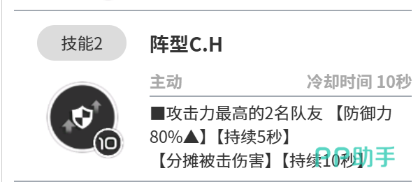 阿妮斯的主动攻击技能,该技能的冷却时间只有10秒钟,可以频繁的使用,阵型C.H技能在使用时会自动将目标锁定为我方攻击力最高的两名队友,在该技能的作用下,队友的防御力将会提升80%,能够维持5秒钟的时间,而且该技能使用后还可以直接帮助队友来分摊伤害。