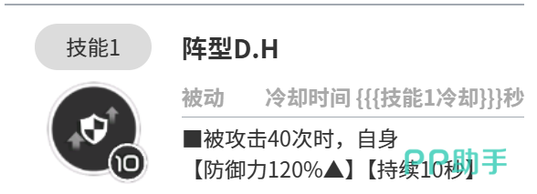 阵型D.H是阿妮斯的被动技能,该技能在艾尼斯被攻击的数次到了40次的时候,自身的防御力就会增加120%,可是维持10秒钟的时间。