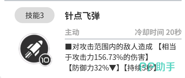 针点飞弹页数阿妮斯的主攻技能,该技能属于阿妮斯的大招,冷却时间需要20秒钟,该技能使用会对自己范围内的敌人造成高额的伤害,使用该技能时,还能把敌人的防御力给下降32%。