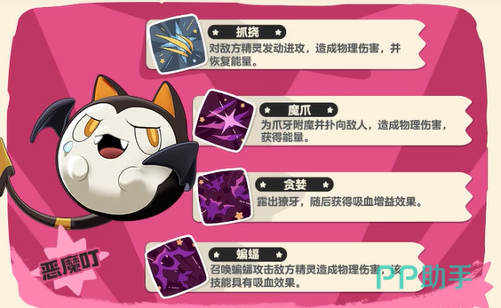 我们先从最为经典的恶系精灵——恶魔叮说起。作为一只种族值达到486的精灵,恶魔叮不仅外形威猛,且技能也极具威胁。它的特性是先手攻击时造成伤害100%吸血,这使得它在战斗中非常耐打。再加上它拥有的技能——造成伤害时能降低敌人攻击力,同时攻击后下次攻击威力翻倍,恶魔叮是非常适合进攻型玩家的一只精灵。通过进化,它能够变身为叮叮恶魔,提升攻击力,变得更加强大。