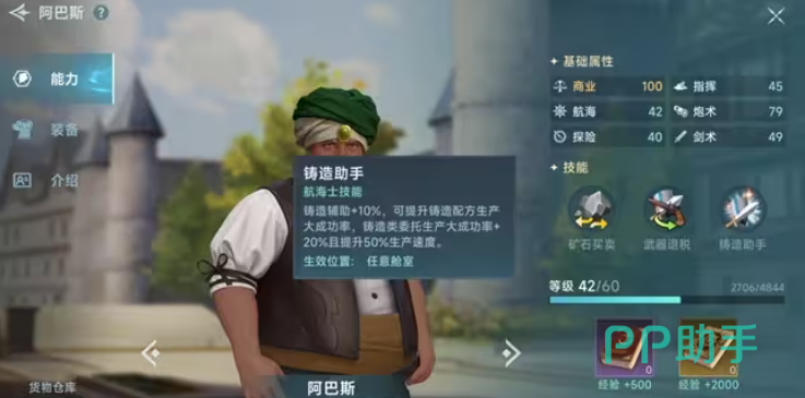 阿巴斯是一位工匠,他的二技能可以帮助进行退税,他的三技能可以铸造辅助提升10%,还能提升铸造配方生产大成功率和50%的生产速度,对于需要大量铸造的玩家而言必备。