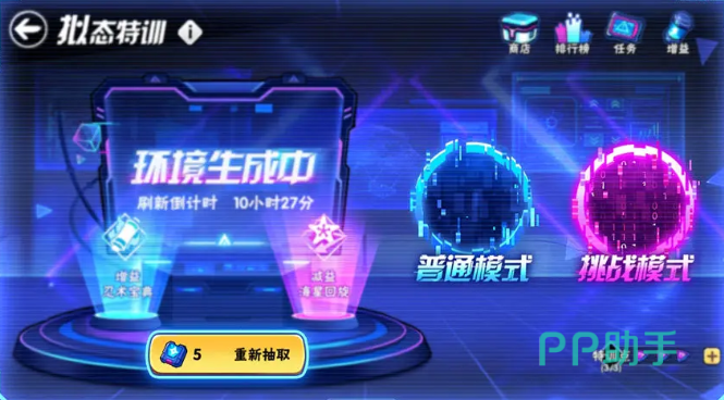 普通模式分为三个难度,每次挑战消耗1个特训点,每通关一个难度,就可以获得相应数量的β核心和β数据。挑战模式分为困难,修罗,炼狱3个不同的难度,每通过其中的难度就能获取对应的限定丹青小姐姐超Q头像一枚。