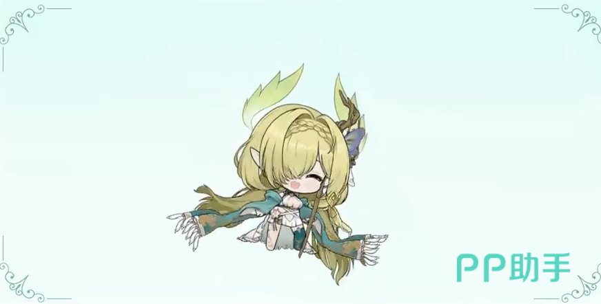 立绘的整体风格是偏自然魔法系的治愈型少女,融合了中世纪精灵或德鲁伊的形象,手持一根像是法杖的藤蔓装饰物,上面挂着一个灯笼。淡绿色的长发,带有自然气息,点缀着蝴蝶发饰与花朵。整体服饰是开放式的仪式感礼裙,绿色与白色是主色调,边缘有金色花纹装饰,呼应自然与生命的主题。