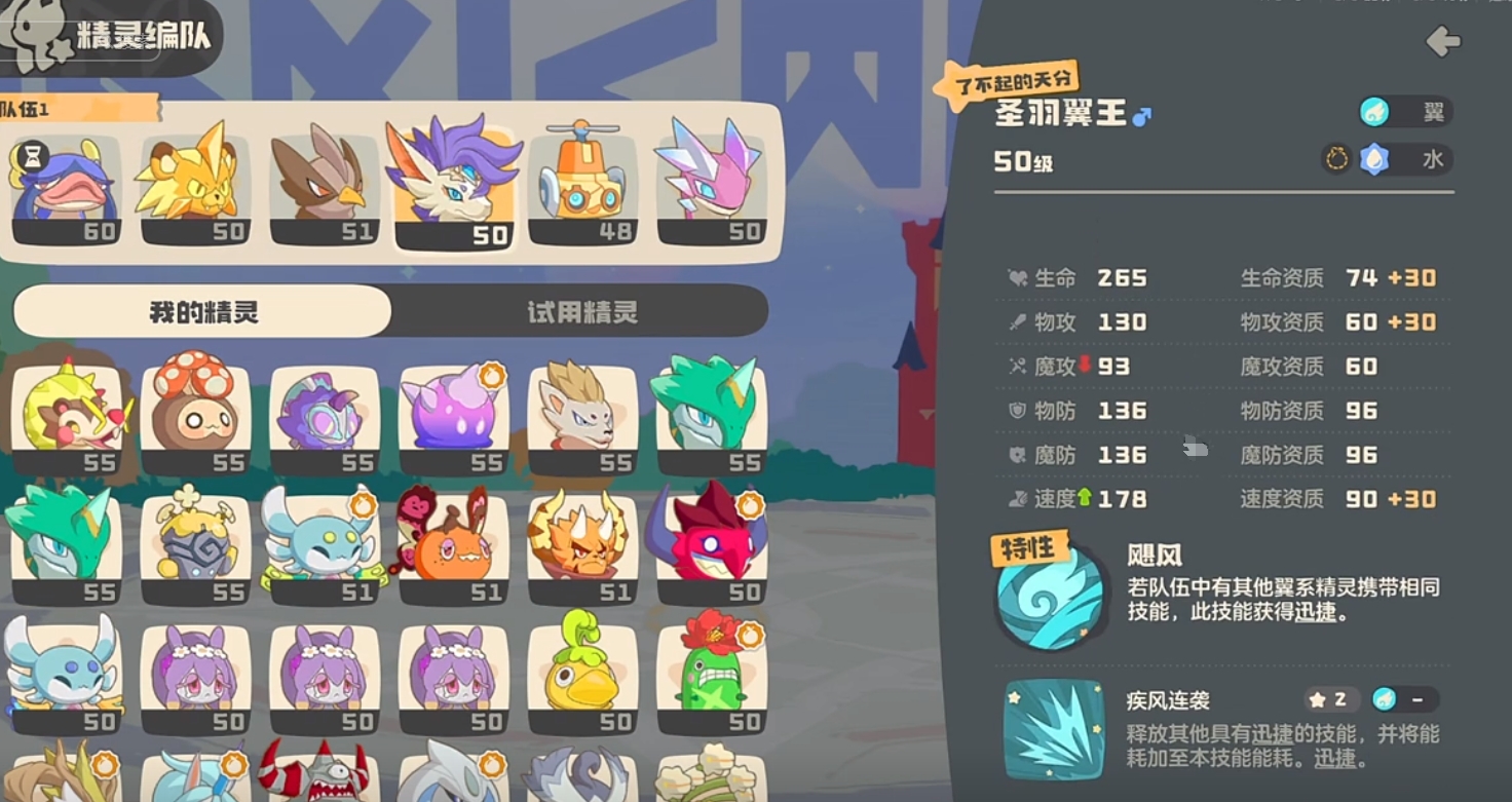 值得一提的是圣羽翼王的特性是能为队友提供迅捷属性,通俗就是速度加成,提升队伍整体出手顺序,而其他翼系精灵,像帕帕斯卡这种则是能进一步放大团队优势。