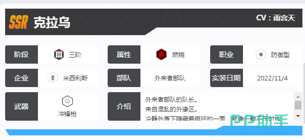 克拉乌为SSR品质,定位防御型,定位于防御型,手上的冲锋枪就是主要的关键所在,整体的优势性还是很不错的。战斗中的克乌拉,实力真的不容小看,每一次攻击都会造成将近8.94%的攻击力伤害。