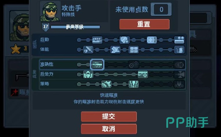 在技能方面,攻击手拥有技能如下:快速瞄准,在瞄准射击的时候,拥有更快的射击速度。致命射击,常规攻击有5%的几率,造成33%的额外伤害。步伐坚定,瞄准射击能力不会再停在当场。障碍射击,利用掩护位置,能减少20%的后坐力。稳定姿态,通过前倾,减少首次射击的70%后坐力。老虎钳,基本后坐力恢复速度增加35%。双闪,闪光弹会爆炸两次,更快地产生眩晕效果。恐吓,敌人受到惊吓惊慌失措,减少施加的伤害,持续两秒钟。攻击跳跃,落在敌人头上时,会造成15点伤害。