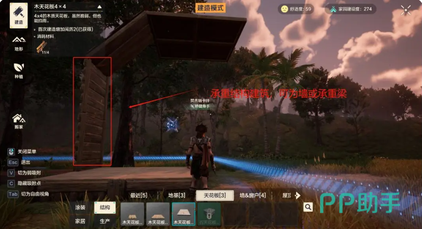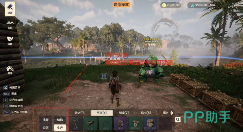 进入建造模式后,大家可以在”涂装、结构、家居、生产”里面去选择要建造摆放的建筑,但是需要先解锁建筑的配方,然后准备好所需的材料,才能展开建造。结构类物品是房屋打造的关键,建造房子是需要注意承重的合理性,不然房子就有可能崩塌。