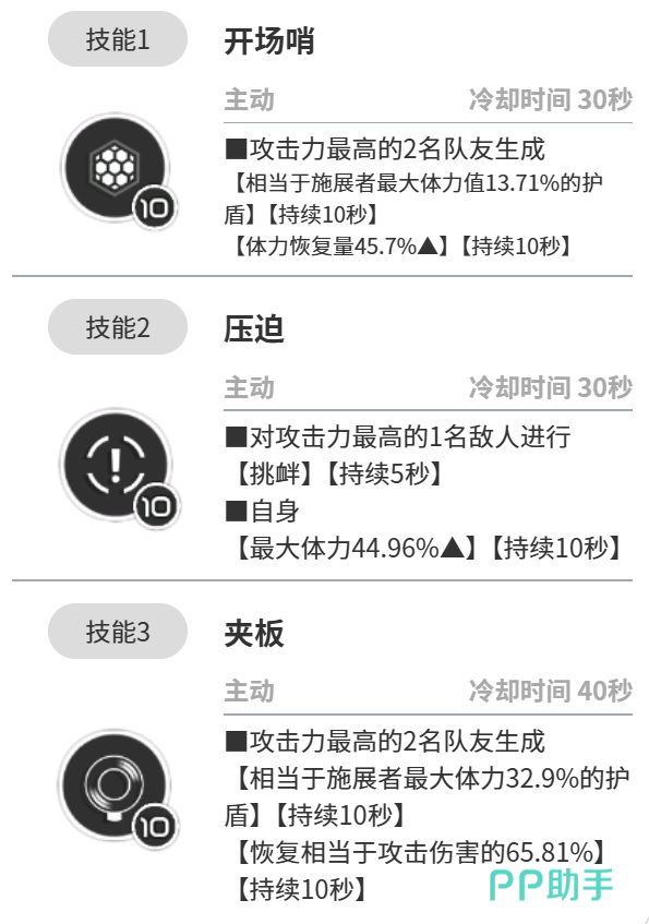 别看开场哨这个技能需要30秒的冷却时间,可技能的作用却非常的大,该技能不仅可以给团队中输出能力最强的2名队友生成一个保护盾,这个保护盾相当于是富克旺的最大体力值,还能给队友恢复45.7%的体力。