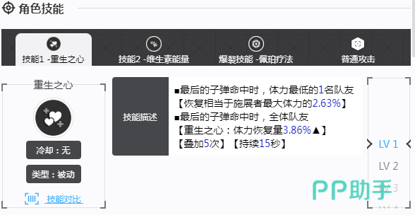 从技能机制方面来看,在关键的时刻也可以提供火力。重生之心是被动技能,这一个技能就等同于是团队的续航关键。一旦最后一颗子弹在命中之后,会给乙方成员生命值最低的单位恢复生命值,这就等同于雪中送炭。刷新之心这一个技能就可以有效恢复6.53%的生命值,并且会持续15秒,能提升团队整体的回血效率。维生素能量是主动技能,可以针对敌方成员较高的单位产生伤害,并且还会削弱敌方核心输出。