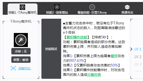 T.Rony 轰炸机这是一个被动技能,一旦在攻击命中目标之后,那么就可以直接触发累积爆炸的技能,并且还会有持续5秒的优势。这一个技能就可以累积部分的伤害,最终就可以达到1536%。这一个技能让他在战斗的过程中就可以在关键时刻爆发。