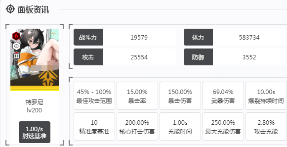 手中的狙击步枪最大的装弹数是6个,换弹的时间是两秒。普通攻击可以给目标造成大概69.04%的伤害,在蓄力一秒之后,全蓄力伤害就可以直接达到250%,核心的伤害是200%。各项面板的数据还是比较可观的,攻击力达到25,554,暴击伤害达到150%。