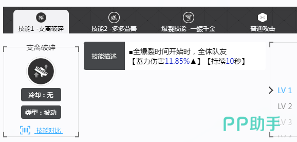 核心技能是支离破碎,在全爆裂时间开始时就能有效提升队友的蓄力伤害,并且在10秒的时间内都有效果。技能等级越高则意味着伤害提升幅度越大,最高就可以有效提升21.55%的全队蓄力伤害。