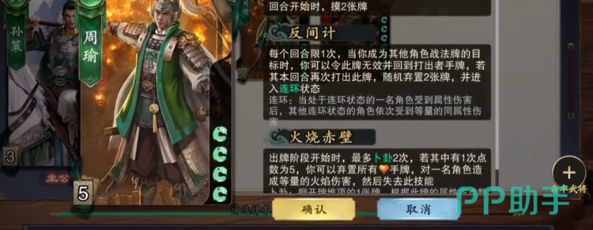 同时在使用二技能时,也可以来无效对方的技能,如果已经成为锦囊的目标,还可以来获得伤害来源的卡牌,可以当做一个锁定技能来使用,三技能也是非常不错的,大家可以来使用火烧赤壁,对敌人直接造成火属性的伤害,这个技能是可以来进行判定的,出牌阶段先判定两次,如果一共有五个点是可以来限制自己所有的红桃牌,然后对敌人造成伤害。