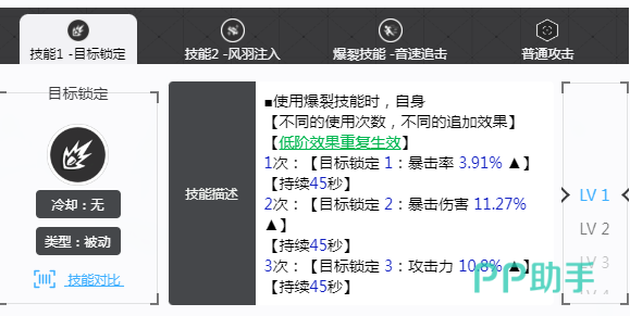 在战斗方面,技能机制主要是围绕目标锁定展开,这就是一个被动技能,会和爆裂技能联动在一起。在每一次使用爆裂技能时,就可以获得一个不一样的追加效果。一般使用一次就可以提升暴击率,使用两次就可以追加暴击伤害。
