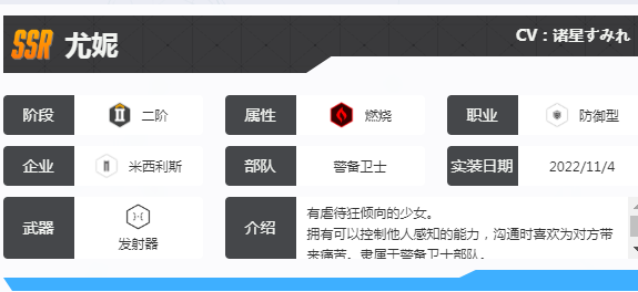 尤妮这就是游戏里面一个防御型的角色,武器就是发射器。相对而言,性格比较独特,会有虐待狂的倾向,在沟通时总是喜欢给对方带来痛苦。今天就为大家介绍一下胜利女神新的希望尤妮,看一下这个角色到底有哪一些主要的特色,整体的优点在什么地方?