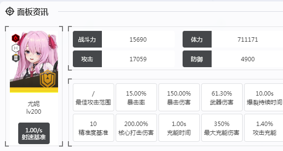 在战斗方面,尤妮的技能主要是以辅助型技能为主,普通攻击在蓄力之后就可以针对目标直接造成高额伤害。换弹的时间为两秒,被动的技能还是比较实用的。全爆裂时间开始时就可以有效提升全队的蓄力速度,而且还会持续10秒。随着技能等级慢慢的提升,蓄力的速度加成也会逐渐的增加。最后子弹命中之后还会有效提升友军的普通攻击。