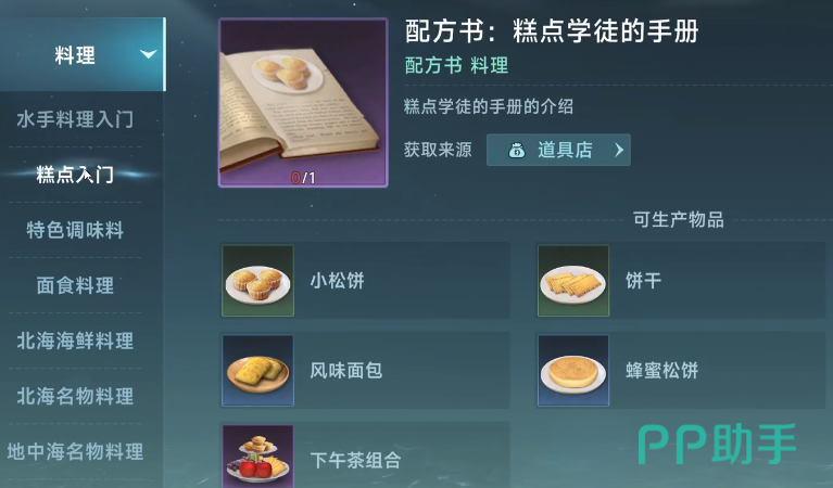 新手玩家们,可以先点击主菜单,会看到一些生产的选项,其中就拥有许多可以来做料理的项目,包括一些水手料理入门的内容,还有糕点或者特色调,味品和面食等等,每一个地方都会有相应的烹饪内容,料理的种类是非常复杂的,大家需要先来解锁相应的配方,才可以进行制作,配方指的是同类型的项目,而不是美食。