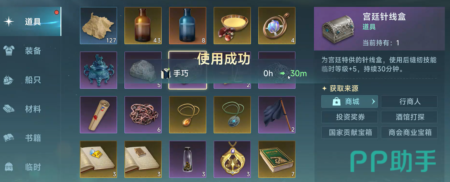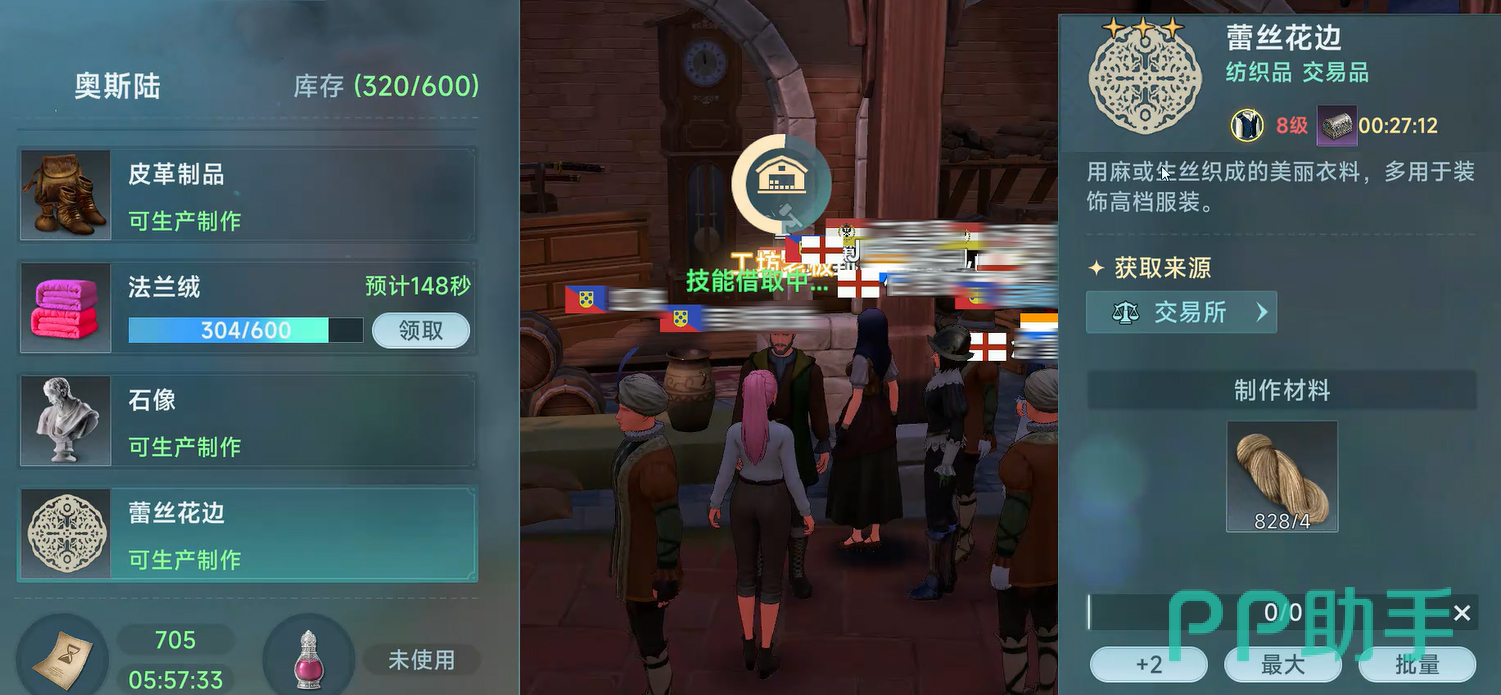 这时大家别忘记使用赶工通知书,就可以加快生产了,之后获得海量经验后。等到缝纫3级加临时5级,合计8级时,就可以制作蕾丝花边了。然后继续按照之前所讲述的方法去制作大量的蕾丝花边,就可以加快升级速度,并获得大量的缝纫品。