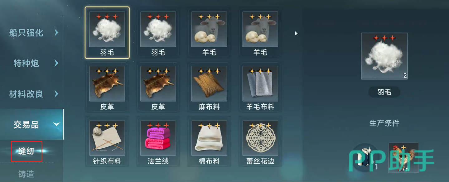 如果大家想要找到缝纫项目的话,可以先点击游戏栏目中的生产菜单,接着再下拉到交易品,点开之后就能看到缝纫了。然后在里面就能看到目前所可以制作的所有缝纫配方,从最低级到最高级都应有尽有。不过不同缝纫品所要求的缝纫等级和材料均不一样,大家可提前了解后再加工。