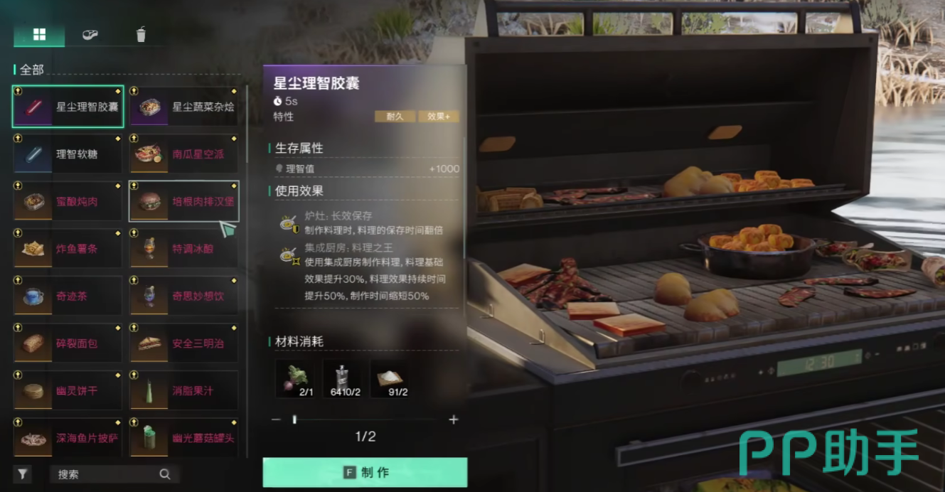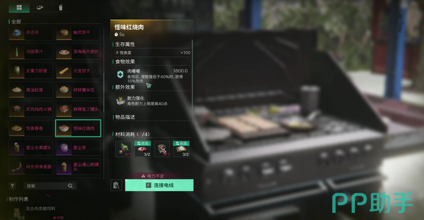 当然,玩家在游戏当中,也可以使用异味软糖制作怪味红烧肉,怪味红烧肉可以增加玩家饱食度一百点,并且附带有增加免伤的效果,当玩家理智低于40%时,可以获得15%的免伤能力。