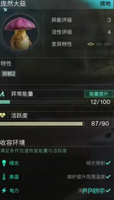 玩家获得庞然大菇之后,需要将庞然大菇直接放到收容仓当中,还需要给它提供绿色的光照和高温环境,才能够让它异能。当它的异能达到30点,庞然大菇将会进入到工作状态。