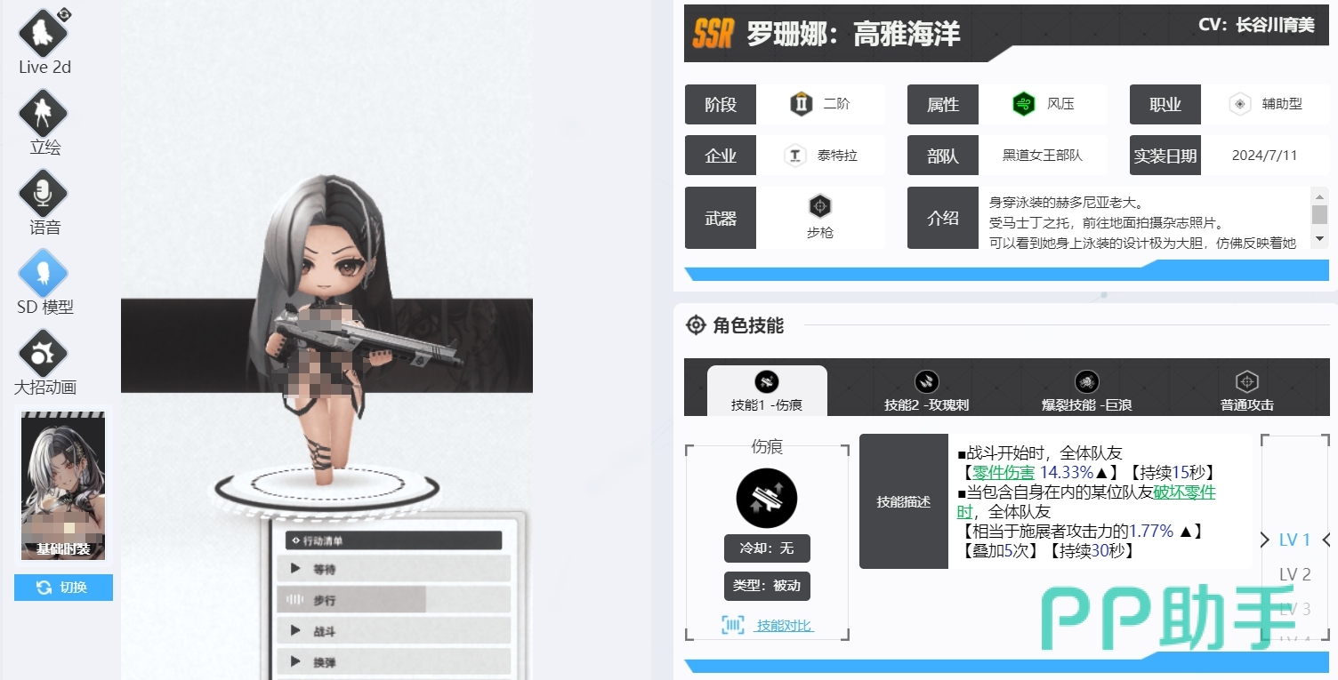 罗珊娜高雅海洋有着SSR的稀有度,属性为风压,职业定位是辅助型,由泰特拉企业打造,隶属于黑道女王部队。她使用的武器是步枪,而她的身份也颇为特别——身为赫多尼亚老大,受马士丁之托前往地面拍摄杂志照片,身上泳装,仿佛也映射着她独特的性格。