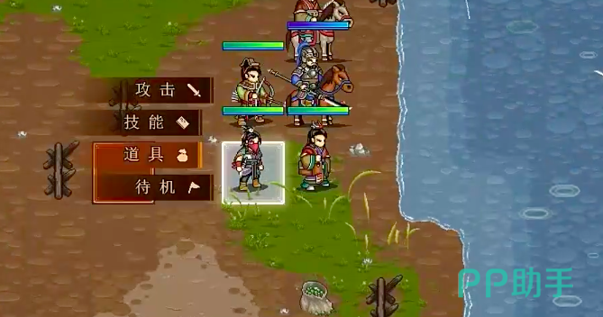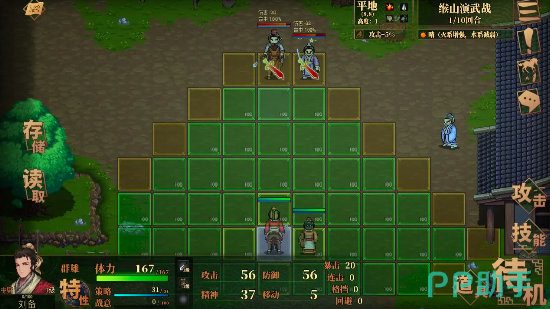 之后玩家只需要点击对应想要修改的武将,在他的身旁会出现攻击、技能、道具、待机四大选项,点击任何一个选项,都可以对其中的相关信息内容进行更改和查询,玩家可根据当时的情况,来快速更改武将所携带的武器装备,以及自身的技能释放。