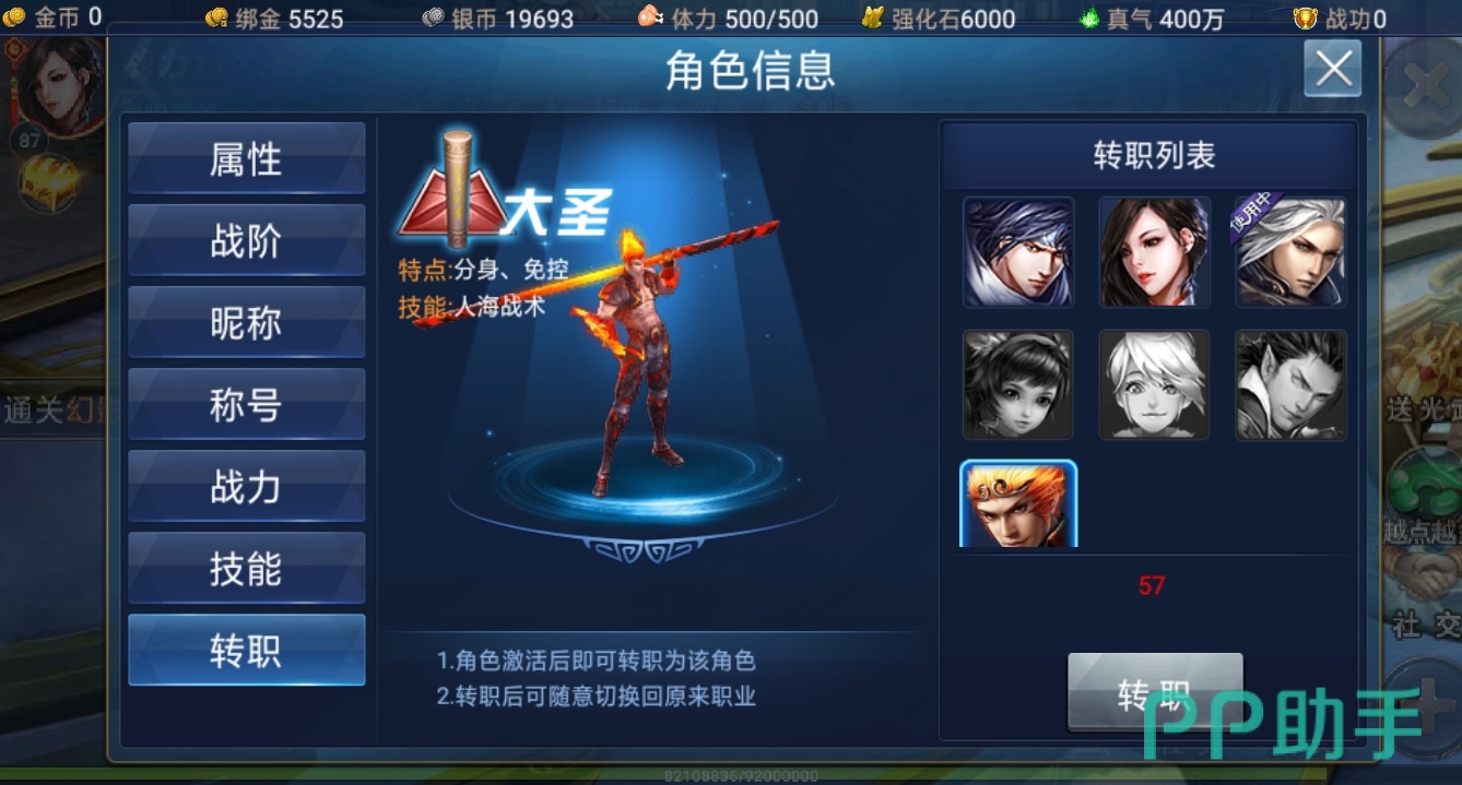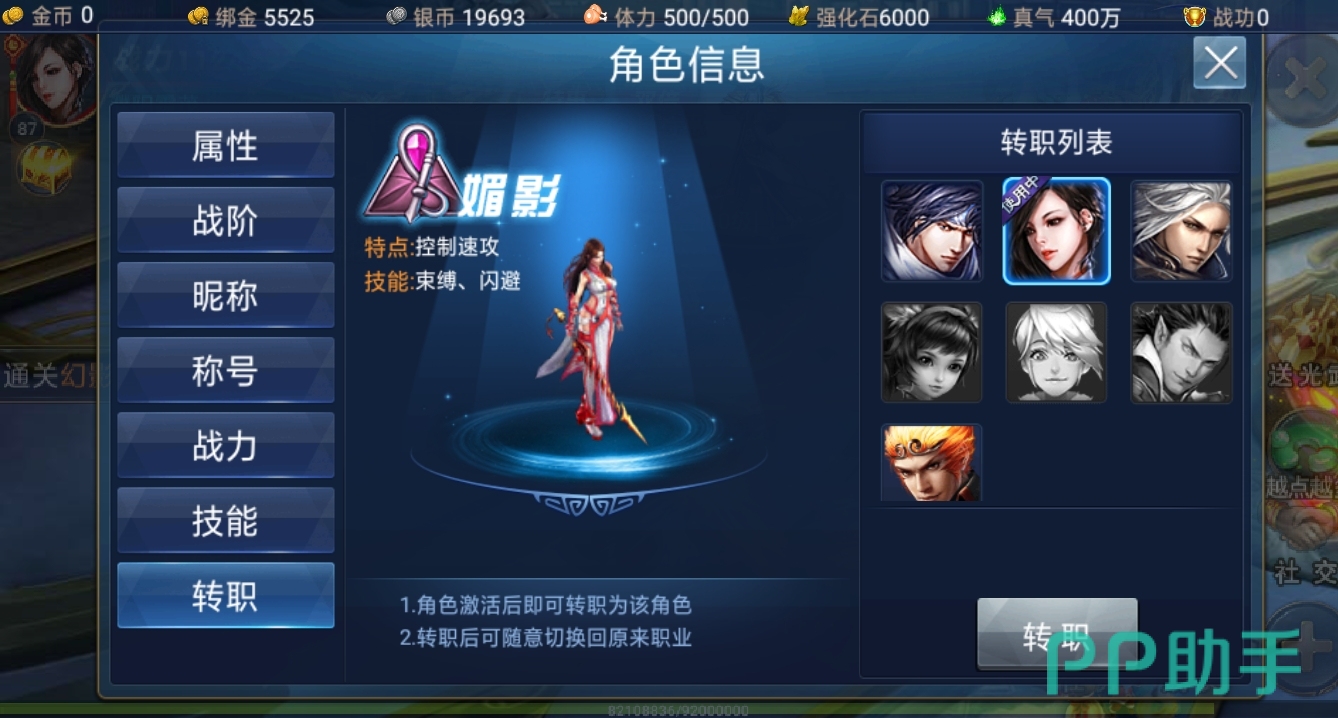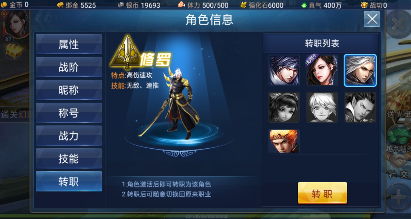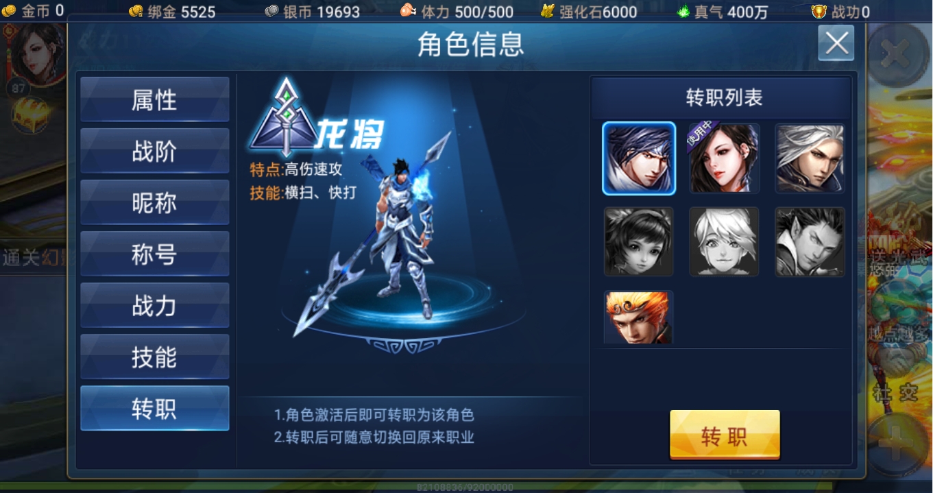 萌新玩家要注意转职界面就在角色信息的最下面,随着小伙伴们战力的不断高涨,可以有四个职业供小伙伴们选择,常见职业分别是龙将、媚影、修罗、大圣。其它的职业就需要玩家拥有对应的激活卡了,枪神自然最受到玩家追捧。