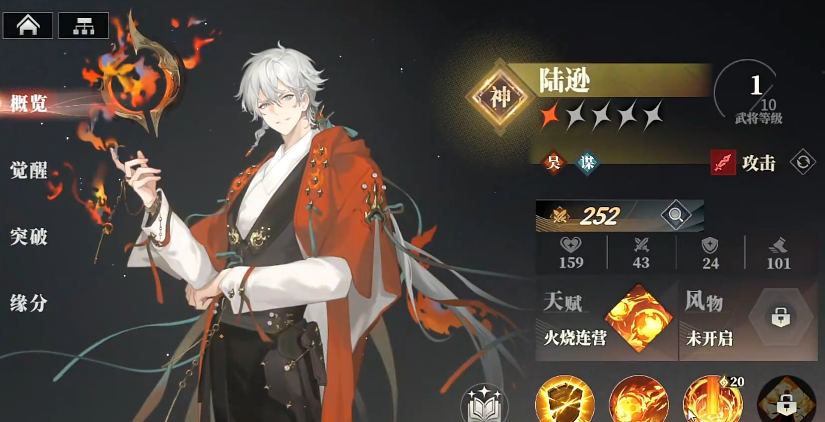 火烧是走法伤体系,2个核心输出周瑜和陆逊肯定是不能少的,周瑜看中的实他的绝技可以全体附加灼烧,配合上天赋提升友方造成的灼烧,简单说就是挂灼烧和增伤。后期转职可以考虑转谋士,在战斗开始的时候全体5%的法术增伤以及下一位队友的20%单次增伤。
