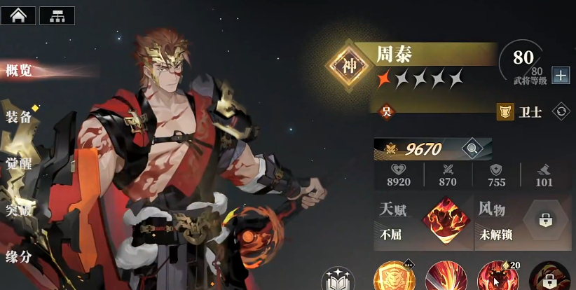 第四个武将人选用“周泰”,他的天赋可以给到队友强有力的保护,可以根据敌人的情况来切换不同的职业。周泰的绝技可以获得高额免伤并且护卫效果,护卫是可以在身后2排武将受到伤害的时候为其分摊部分,手动调整一下站位即可。