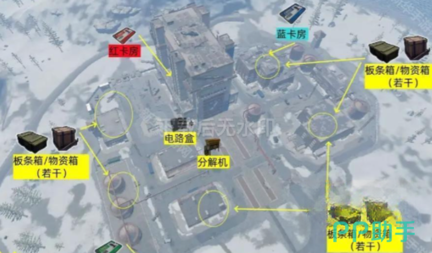 左边位置探索结束后,我们直接移动到军事基地的大楼这里,进入大楼后向左边走可以看到红卡闸点,按照游戏规则,拿到红卡后,返回基地大楼这里,找到楼梯进入二楼向左走就能找到红卡房,使用红卡把大门刷开后进入房间内把屋内的物资想给拿走。