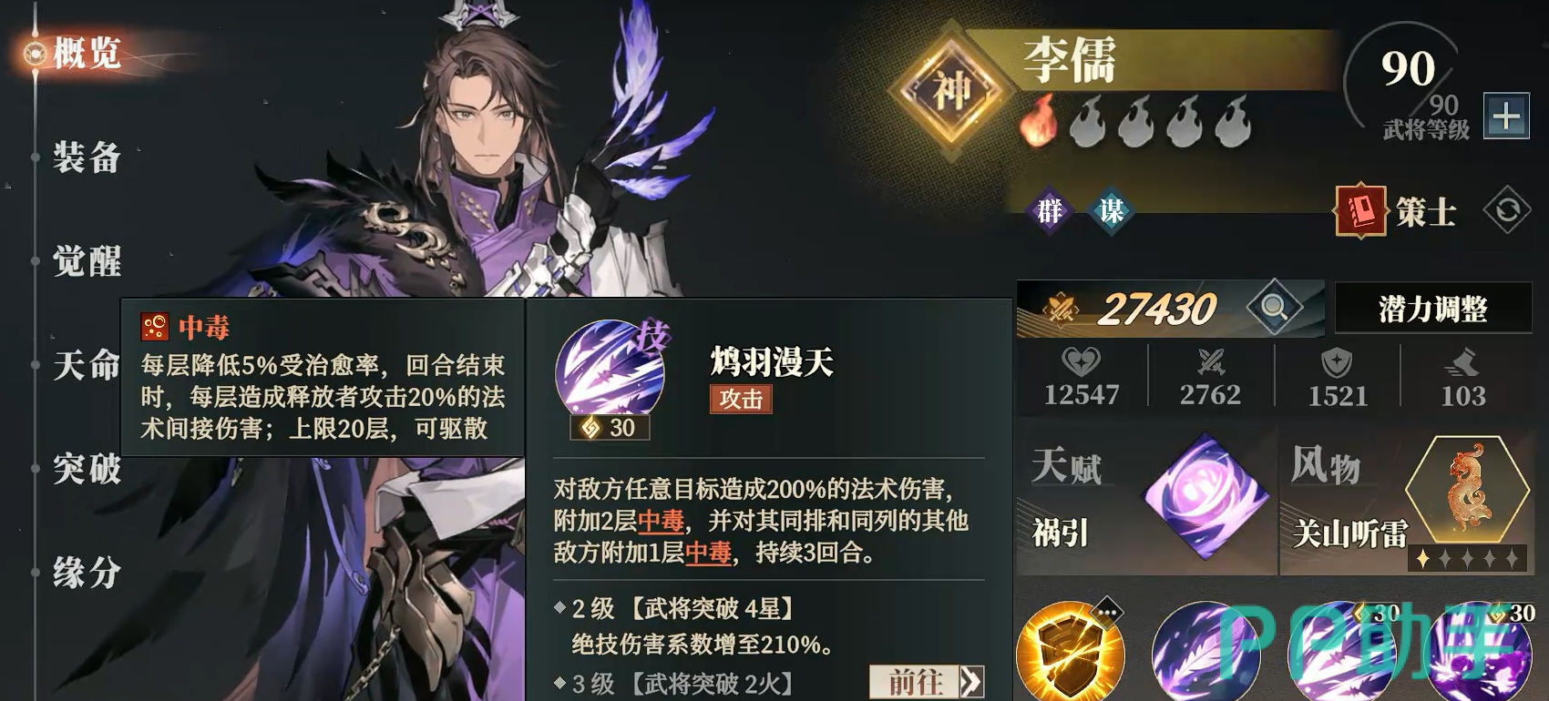 李儒的作用则集中在削弱敌方及控制节奏。在天赋达到三级后,可有效降低敌方增益效果的持续时间,从而间接提高我方生存与输出环境的稳定性。此外,李儒本身的群体输出技能亦有不俗表现。