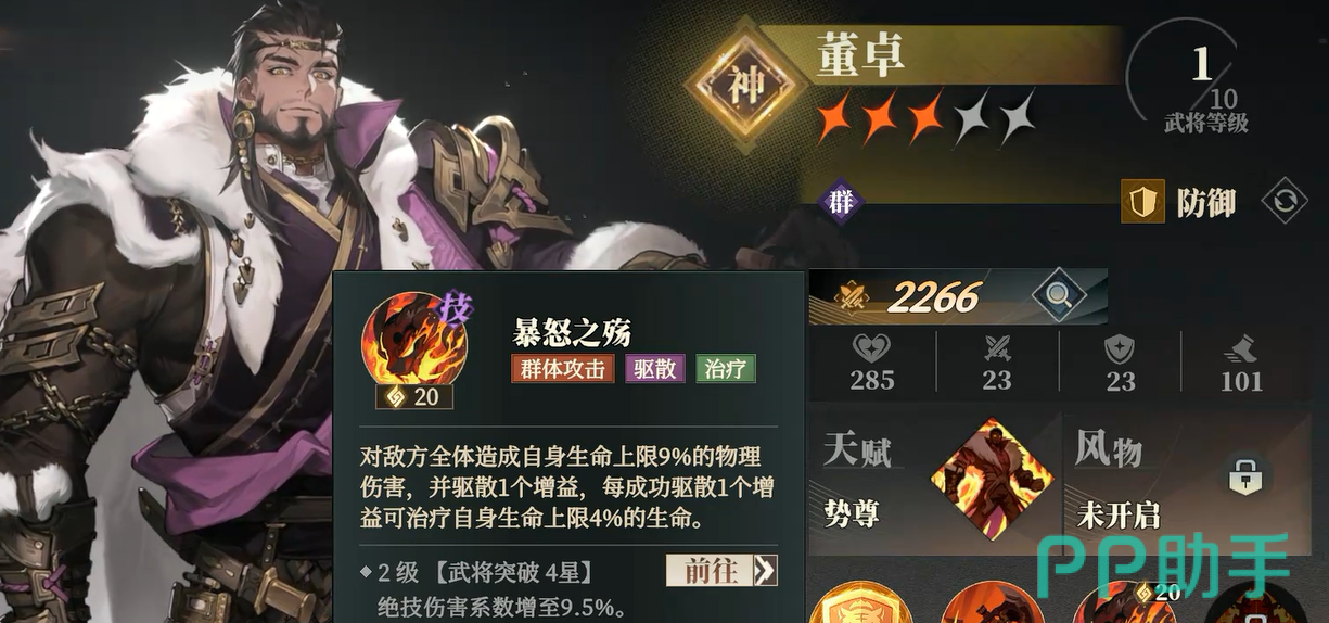 董卓则扮演着多功能打手与体系支点的角色。他的绝技具备全体驱散与百分比生命扣除效果,可针对高耐久敌人打出稳定且难以规避的真实伤害;同时,其技能亦带火属性附加,形成与贾诩毒伤并存的双状态压制。