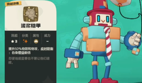 除了迟轮扭矩、电磁偏转外,还可以再配一个“泥浆铠甲”,50%的物防物攻加成,如果应对成功效果翻倍,泥浆铠甲这个技能的能耗是3点,结合特性有一定几率打出连续2次泥浆铠甲,效果可以叠加。