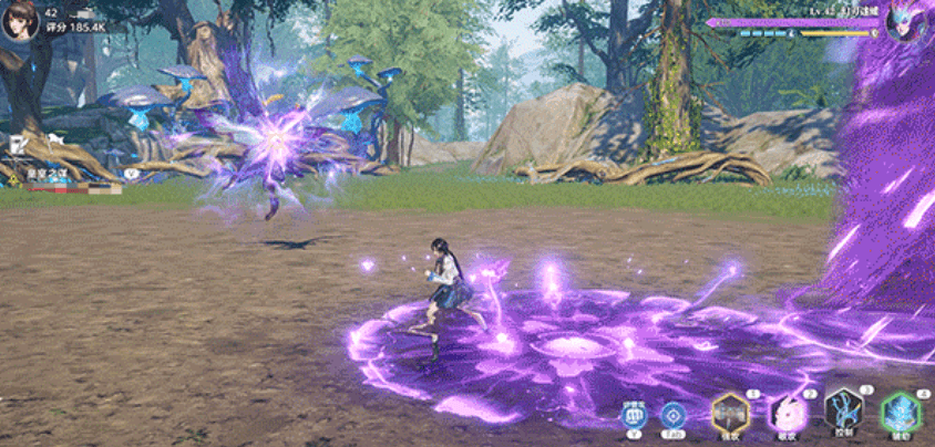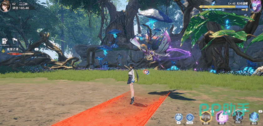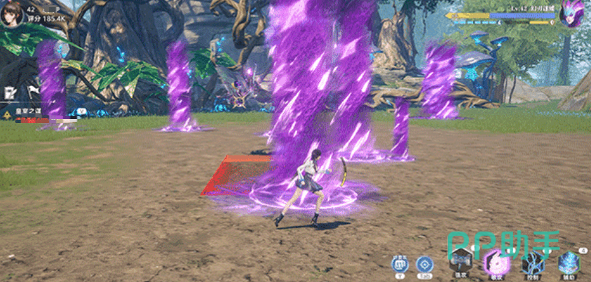 它的第二个技能会在玩家的脚下生成梦境花纹,花纹在一段时间后会向上喷涌出紫色状的龙卷风,造成大量输出,可以在发现脚下有波纹时,快速蹦跑来躲避,它的最后一个技能会一次性召唤三道紫色龙卷风来攻击。