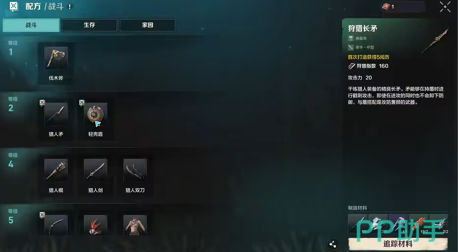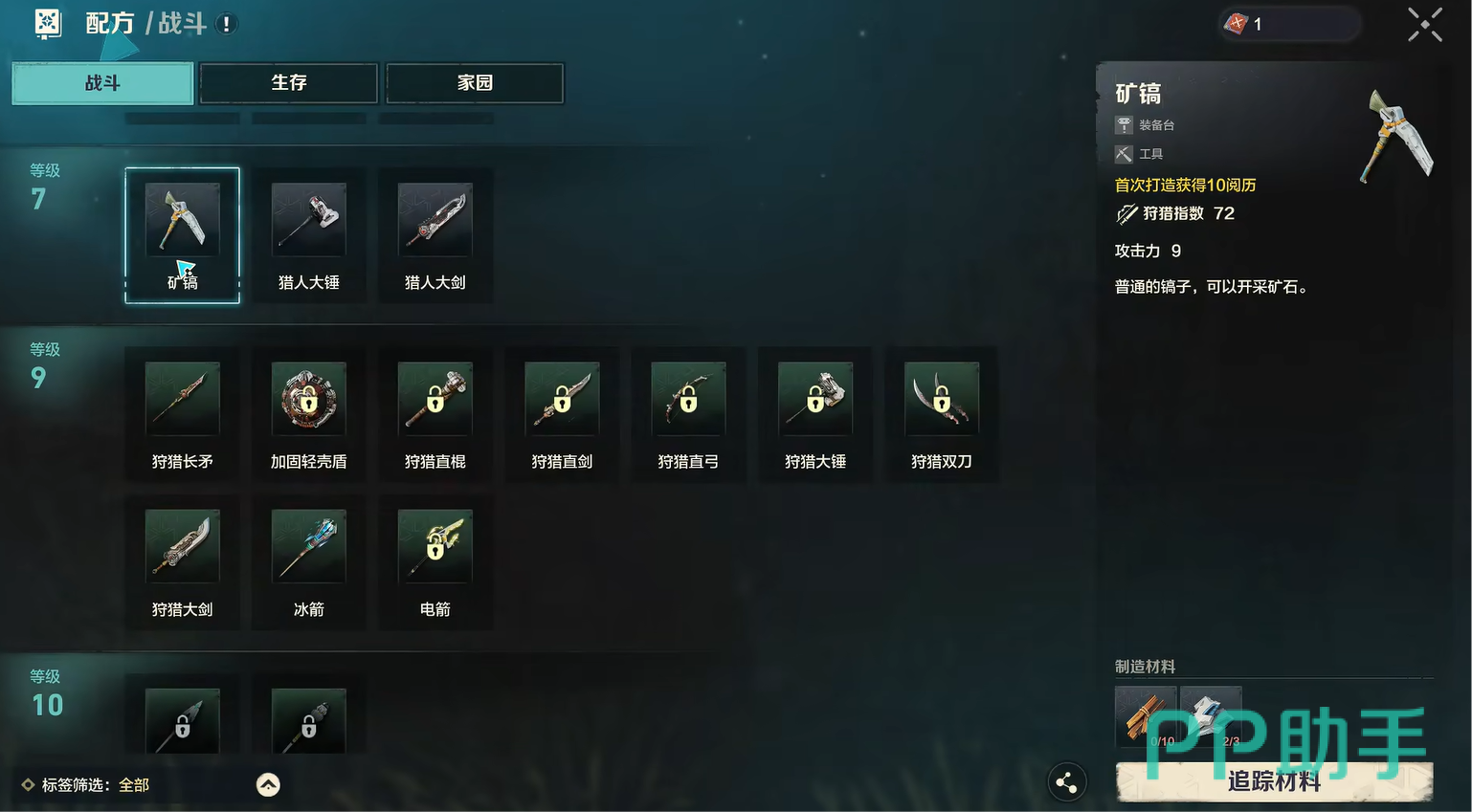 当大家的制造等级达标之后,那就可以准备制作的材料了,也就是10个木材加上3个稀有金属。要是不知道具体的位置的话,也可以直接点击追踪材料,最终即可快速找到。最后点击制作,就可以获得一把闪耀着金属光泽的矿镐了,手感非常好。
