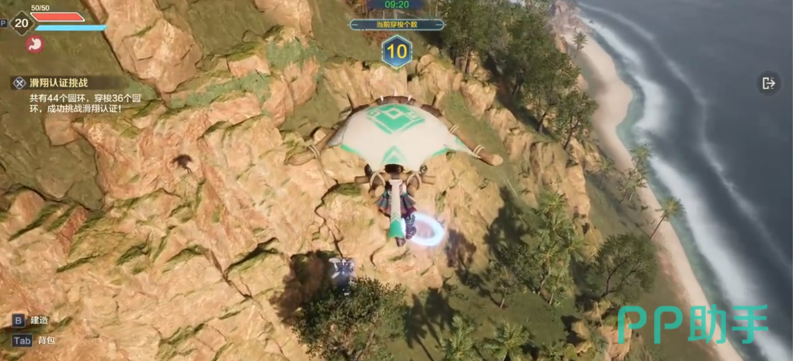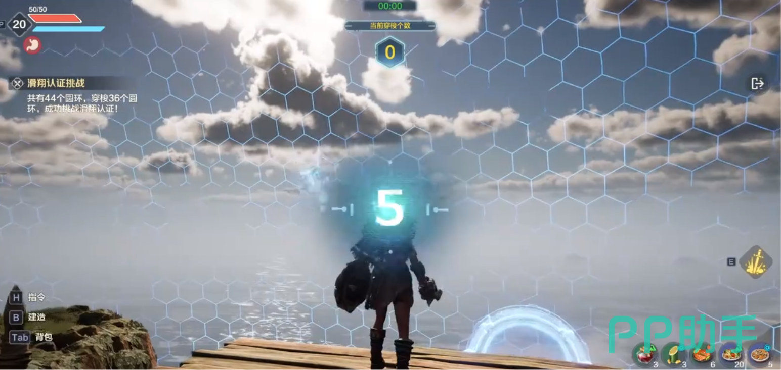 之后可以跟附近的NPC进行对话,接着就可以快速进入挑战地图。经过五秒倒计时之后,大家就可以开始参与挑战了!在这之前需要先了解一下具体的游戏规则,那就是这里一共有44个圆环,期间需要穿梭36个圆环,成功完成挑战即可获得滑翔认证!