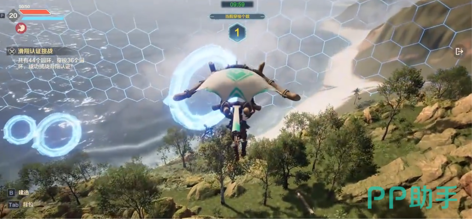 要是大家觉得飞行速度有点慢的话,那就可以直接按住奔跑键,这样就可继续加速!过一段时间之后就会遇到上升气流,进入上升气流时要松开方向键,否则会提前脱离气流达不到高度。如果发现高度不足以飞到下一个目标,可以转一圈回到这个气流重新上升,最终完成挑战之后即可获得拓荒之翼外观啦!