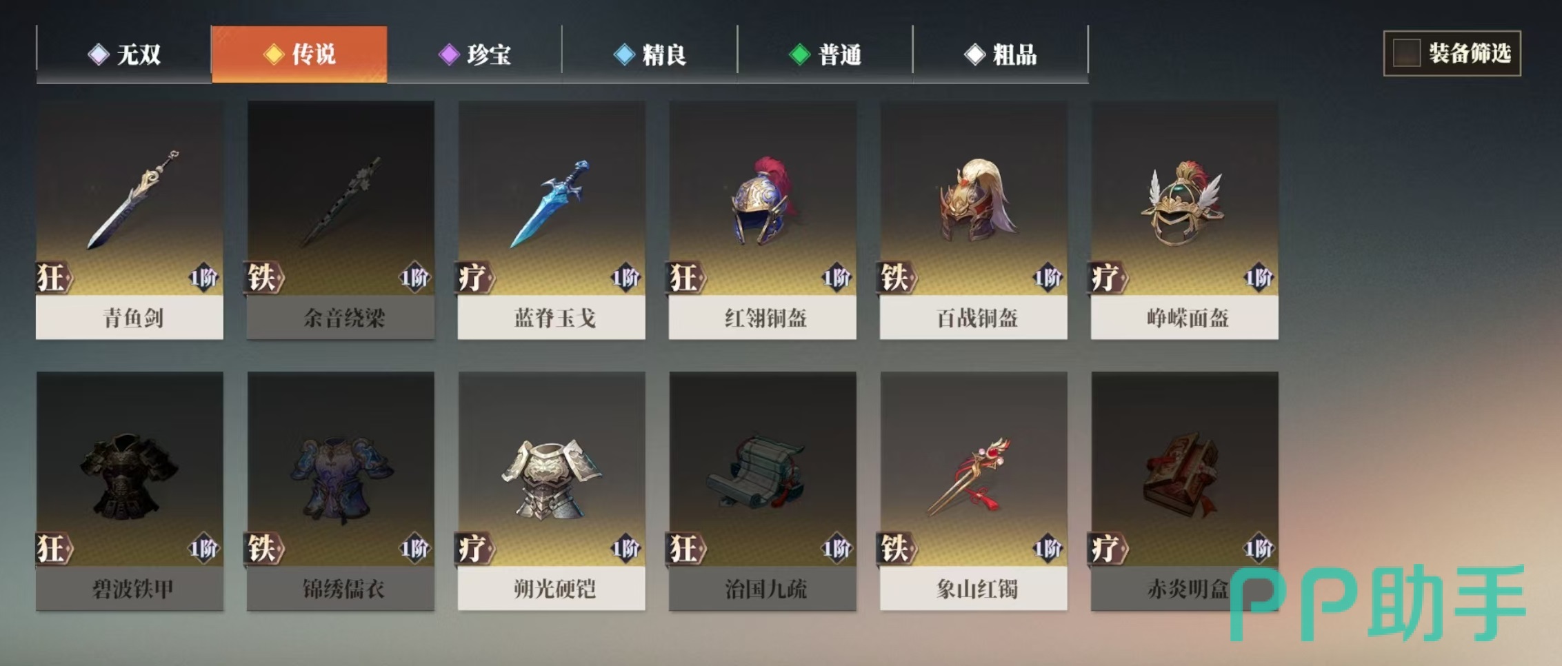 大家打开游戏中的图鉴功能之后,就可以直接看到有装备图鉴,这里面有各种分类,包括无双、传说、珍宝等,只有珍宝也就是紫色以上才会有套装。且紫色套装也只有一个退敌套装,两件套获得1.5%生命和攻击加成,4件套获得2.5%暴击率加成,属性非常低,只有达到了传说以上套装,才能真正发挥作用。传说套装主要包括狂战、疗养、铁甲这三类。狂战能够带来攻击和爆伤加成,铁甲可以带来生命值和暴击力的加成,疗伤套装能增加生命值、攻击力和治愈率,分别适合不同的武将去选择。