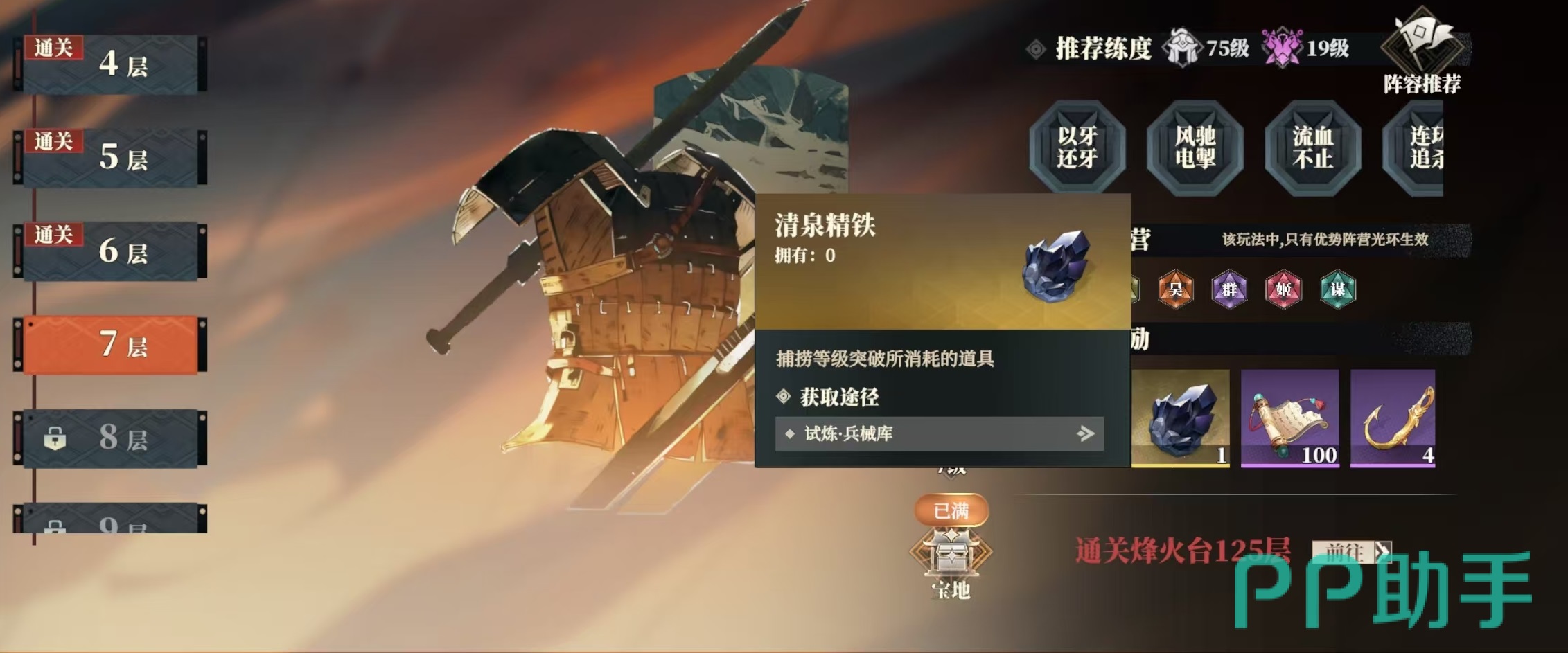 在渔弋中进行操作,所需要消耗的是九曜勾,这个道具主要通过兵械库、烽火台以及组合礼包购买的方式得到。在兵械库中,大家通关的烽火台层数越高,每天可以领取到的九曜勾也就越多,所以应该快速往前推进烽火台。另外每天还要及时过来收取,不然累计满之后就不会再增加了。提升渔弋等级所需要的清泉精铁,是通关每层的兵械库之后才能获得。