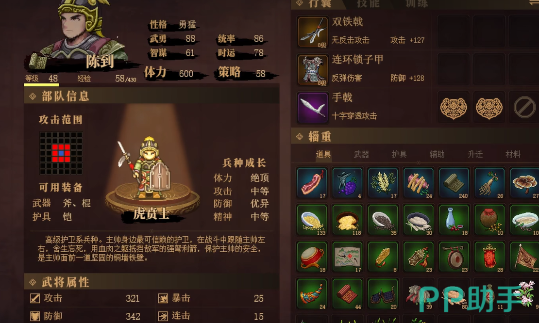 说到陈到,虽然他的转职选择不多,但依然不容忽视。他唯一的转职路径就是“护卫”,这个选择能让陈到在队伍中充当保护角色。强化武器时,可以把暴击伤害和反击提升到最高,同时注意增加一些格挡属性,让陈到的防御更为坚固,确保在战斗中为队友挡下更多的攻击。